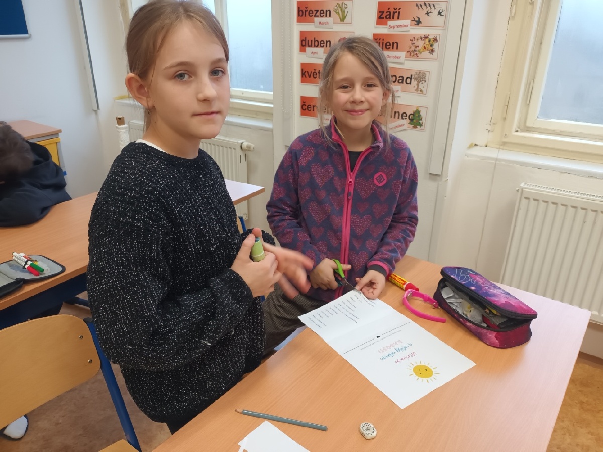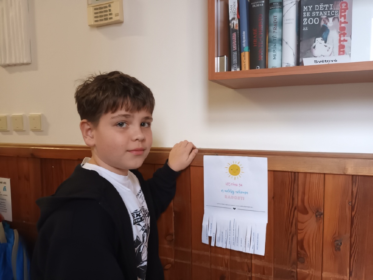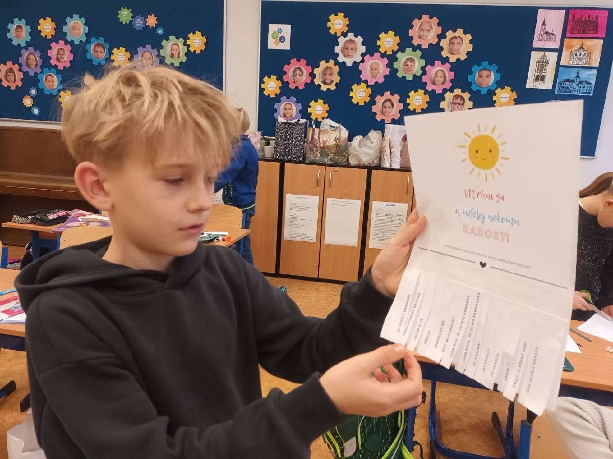 V naší škole máme speciální adventní kalendář. Na každý den připadá nějaký zajímavý a zábavný úkol. Na dnešní den, 2. prosince, připadl krásný úkol, udělat někomu radost nebo učinit dobrý skutek. Žáci ze IV. B se do tohoto zadání pustili s nadšením. V hodině výtvarné výchovy vytvořili originální papíry s odtrhávacími lístečky. Na nich byly milé a povzbudivé vzkazy jako například: „Jsi skvělý kamarád.“ „Moc mi pomáháš.“ nebo „Přeju ti pěkný den!“ Hotové listy žáci rozmístili po celé škole, aby si každý, kdo bude chtít potěšit druhého, mohl jeden lísteček utrhnout a předat dál. A zájem byl velký – už během téhož odpoledne byly některé papíry úplně bez lístečků. Věříme, že se díky nim rozšířilo po škole mnoho úsměvů a příjemných okamžiků. A čtvrťáci? Ti si své přání udělat ostatním radost rozhodně splnili. Mgr. Markéta Štifterová