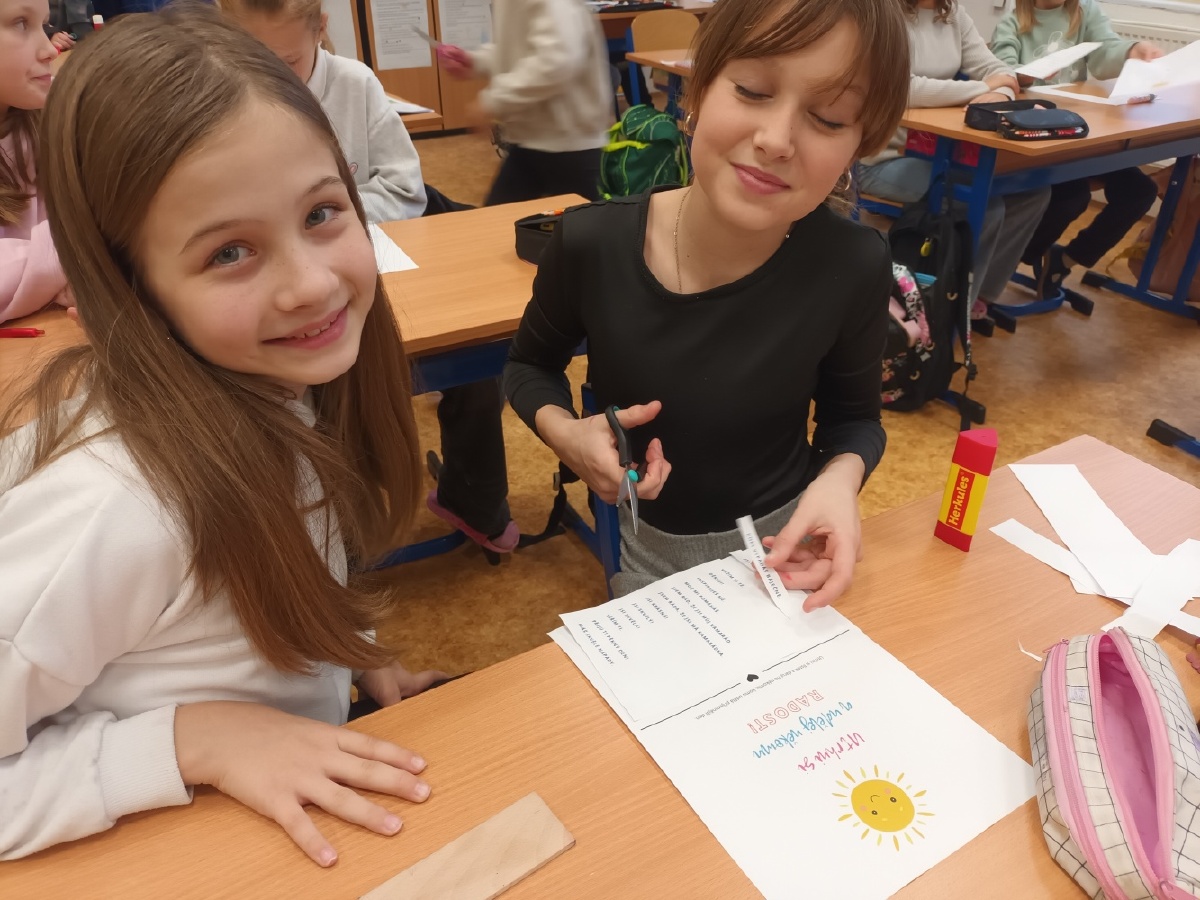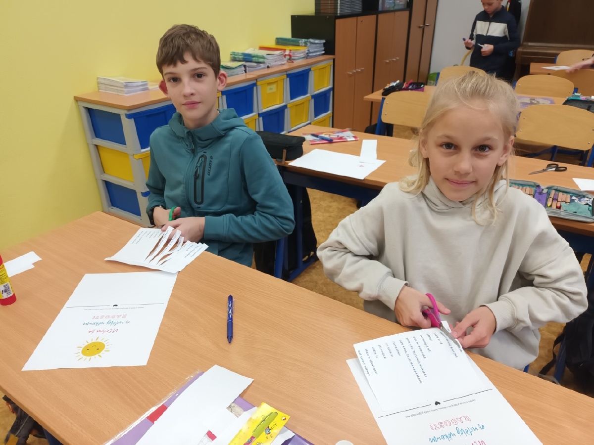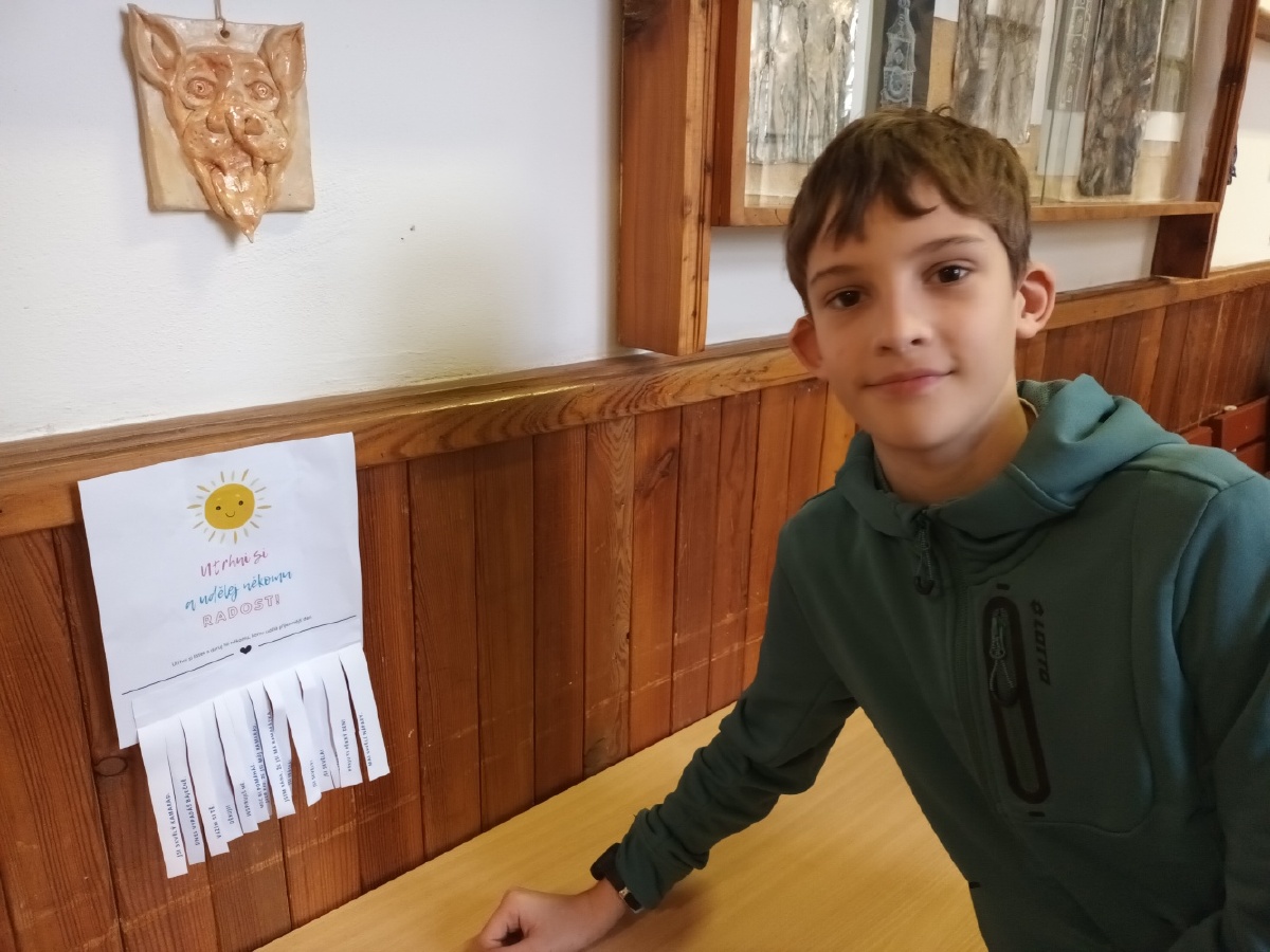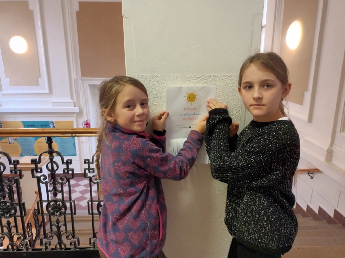 V naší škole máme speciální adventní kalendář. Na každý den připadá nějaký zajímavý a zábavný úkol. Na dnešní den, 2. prosince, připadl krásný úkol, udělat někomu radost nebo učinit dobrý skutek. Žáci ze IV. B se do tohoto zadání pustili s nadšením. V hodině výtvarné výchovy vytvořili originální papíry s odtrhávacími lístečky. Na nich byly milé a povzbudivé vzkazy jako například: „Jsi skvělý kamarád.“ „Moc mi pomáháš.“ nebo „Přeju ti pěkný den!“ Hotové listy žáci rozmístili po celé škole, aby si každý, kdo bude chtít potěšit druhého, mohl jeden lísteček utrhnout a předat dál. A zájem byl velký – už během téhož odpoledne byly některé papíry úplně bez lístečků. Věříme, že se díky nim rozšířilo po škole mnoho úsměvů a příjemných okamžiků. A čtvrťáci? Ti si své přání udělat ostatním radost rozhodně splnili. Mgr. Markéta Štifterová