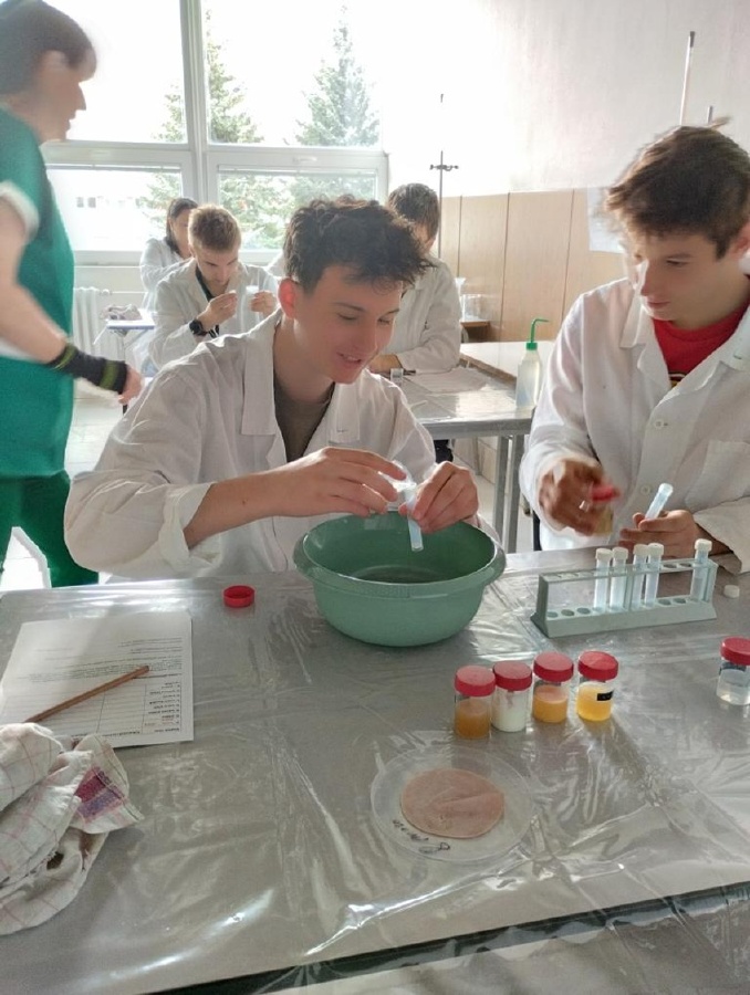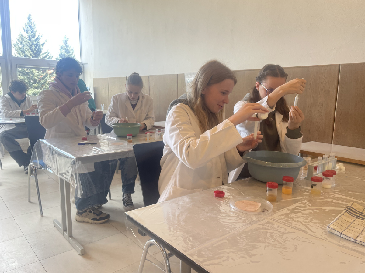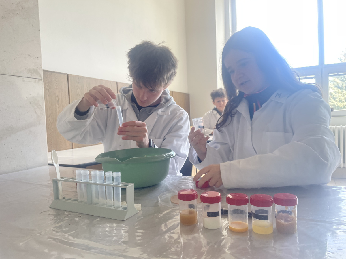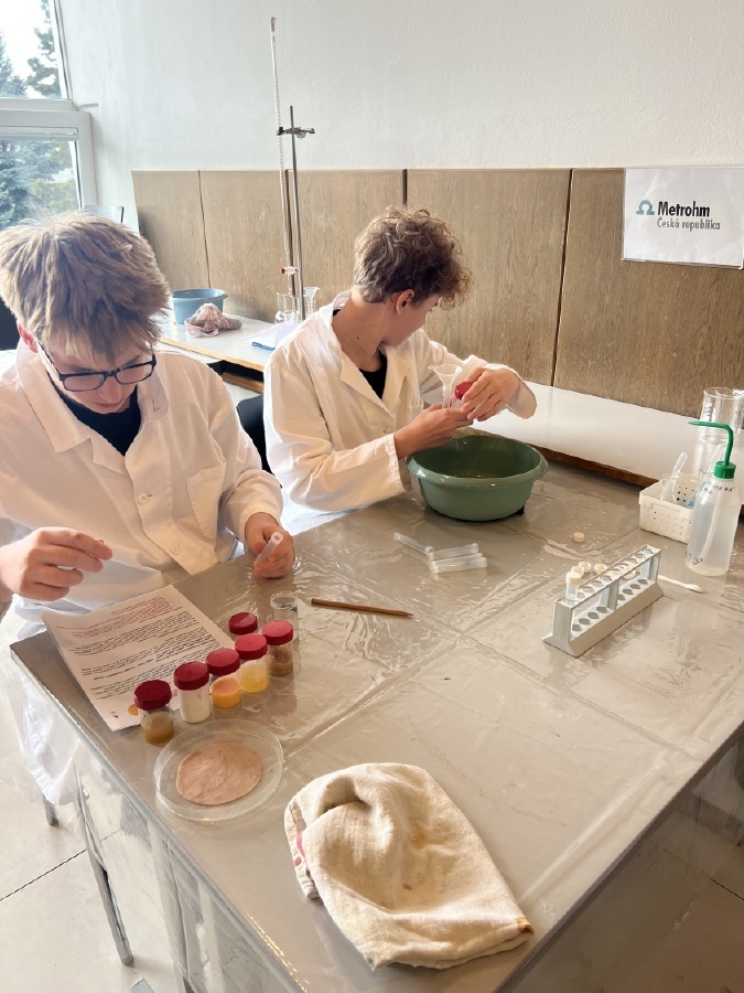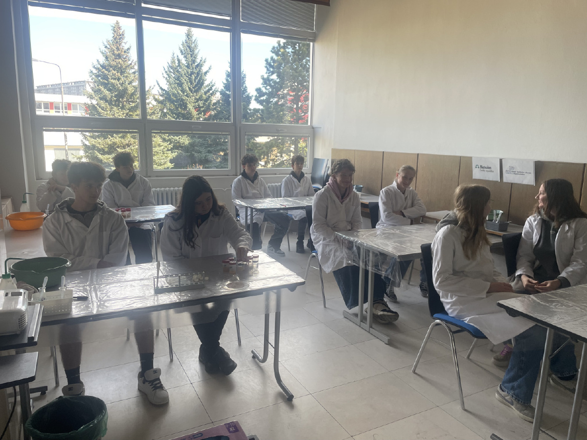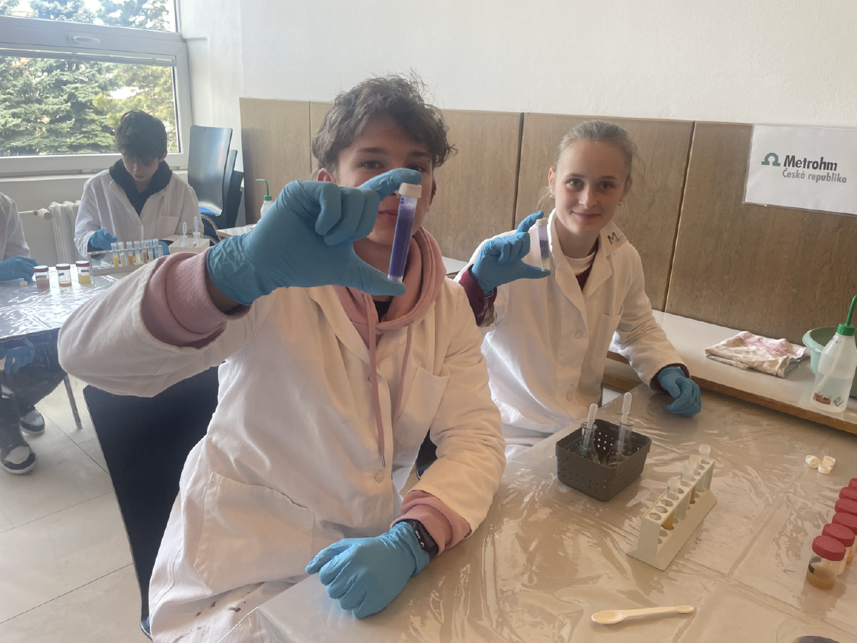 Naši deváťáci navštívili Ústav fyzikální chemie J. Heyrovského, kde si v rámci workshopu vyzkoušeli práci v laboratoři. Žáci se věnovali analýze a stavbě molekulárních modelů organických látek a praktickým důkazům bílkovin ve vzorcích potravin (mléko, jogurt, vajíčko, šunka, džus). Právě možnost samostatného experimentování a práce s modely pomohla žákům lépe pochopit strukturu látek, o kterých se běžně učíme v hodinách. Celý program doplnilo seznámení s odkazem nositele Nobelovy ceny Jaroslava Heyrovského. Pro žáky bylo přínosné především to, že si mohli vše sami osahat a vidět výsledky své práce přímo ve zkumavkách. Ing. Šárka Nováková