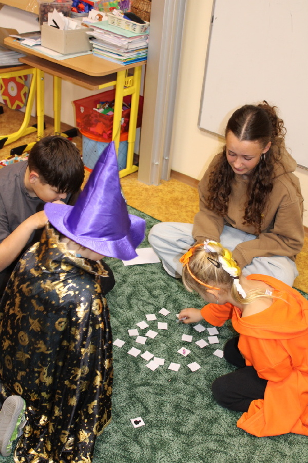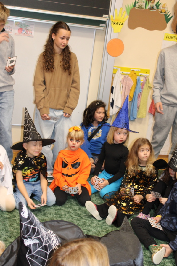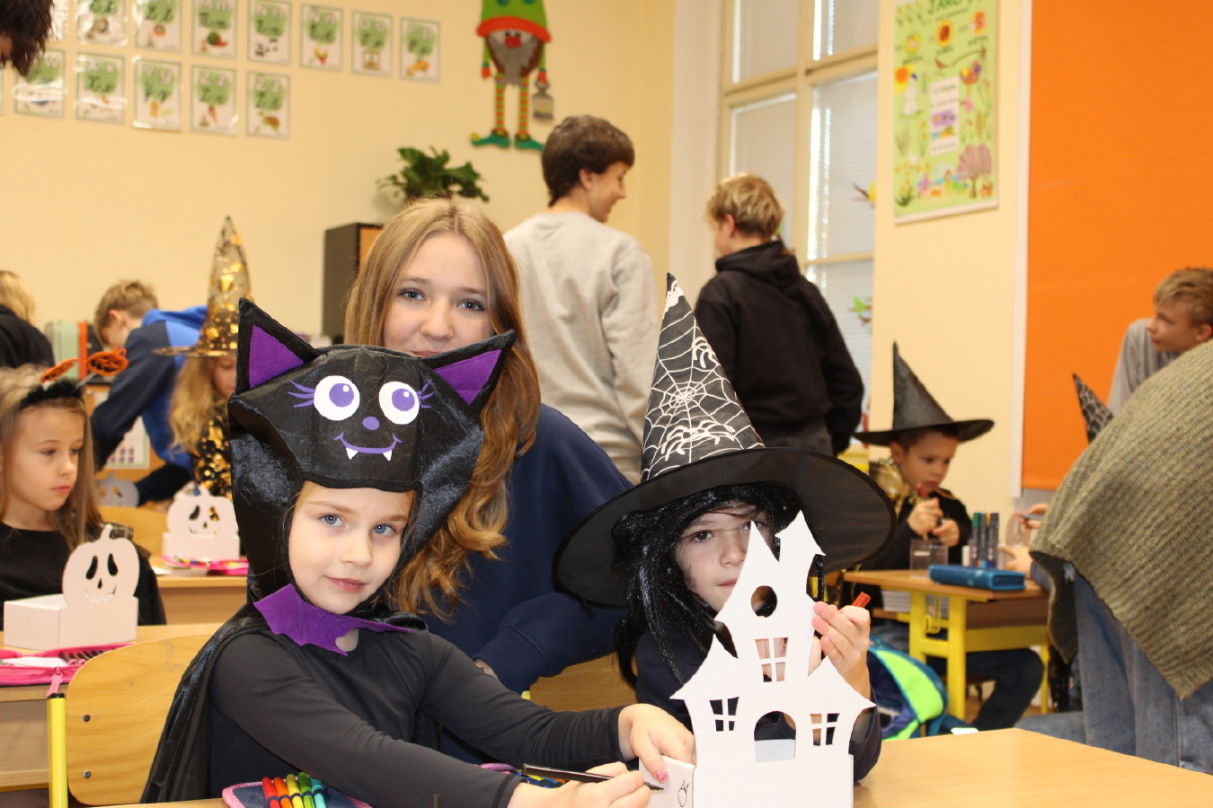 V pátek 31. října ožila naše škola v duchu Halloweenu. Prvňáčci a osmáci se setkali, aby si užili čas společného tvoření, her a strašidelné zábavy. Prvňáčci přivítali své starší kamarády ve skvěle vyzdobené třídě, kde nechyběly pavučiny, dýně a další strašidelné dekorace. Děti měly připravené úžasné kostýmy, které vykouzlily tu pravou halloweenskou atmosféru. Osmáci výzdobu jejich třídy skvěle doplnili velkou vydlabanou dýní se světýlky. Společně strávili první vyučovací hodinu, během které si povídali, vyráběli menší dekorace a hráli zábavné hry, byly to opravdu chvíle pohody a radosti. Poté se osmáci vrátili do svých tříd a u prvňáčků pokračovalo halloweenské tvoření, při němž vznikaly krásné výrobky plné fantazie a barev. Už teď se všichni těšíme na další setkání. Mgr. Šárka Dáňová, Mgr. Jana Němečková Růžičková