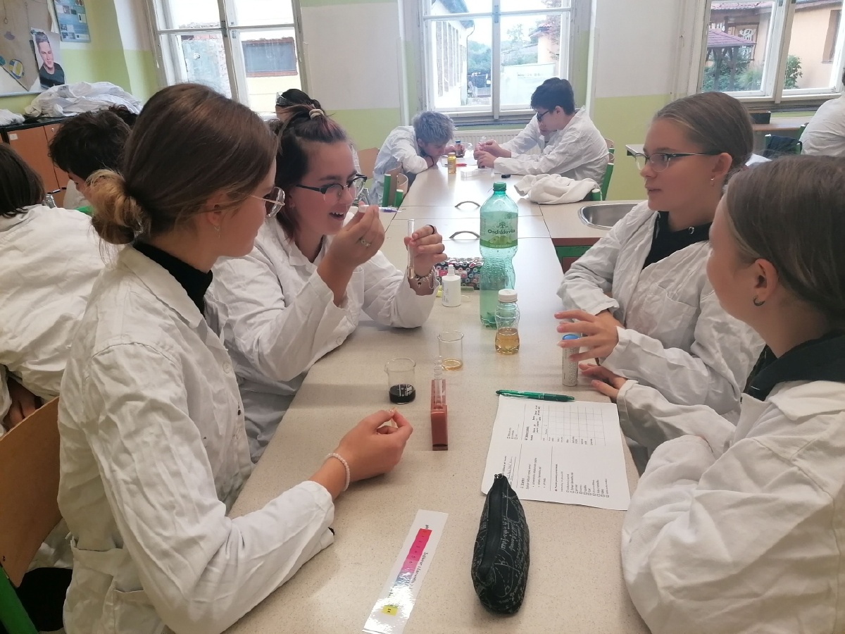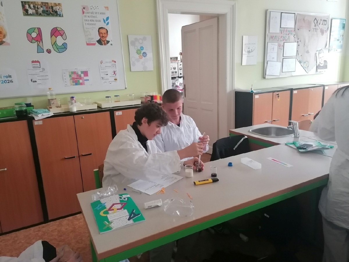 Deváťáci z A a B si během hodiny chemie procvičili určování pH různých kapalných roztoků. Nejprve použili univerzální indikátorový papírek, který mění barvu podle hodnoty pH. Dále si vyzkoušeli práci s přírodním indikátorem – odvarem z červeného zelí, který rovněž reaguje na kyselé a zásadité prostředí změnou barvy. Pro přesné určení pH poté použili pH metr. Porovnáním výsledků z jednotlivých metod mohli pozorovat rozdíly v přesnosti měření a lépe pochopit vlastnosti kyselin a zásad. Práce je nejen bavila, ale také jim přinesla cenné zkušenosti z praktické chemie. Mgr. Hana Ratajíková