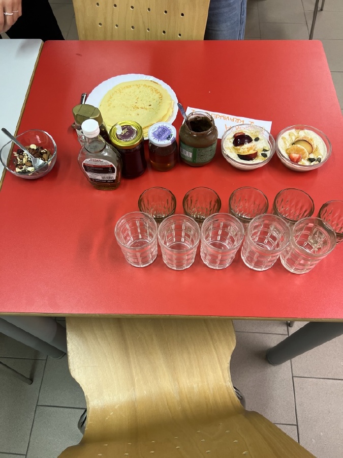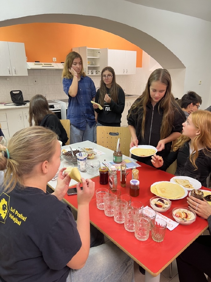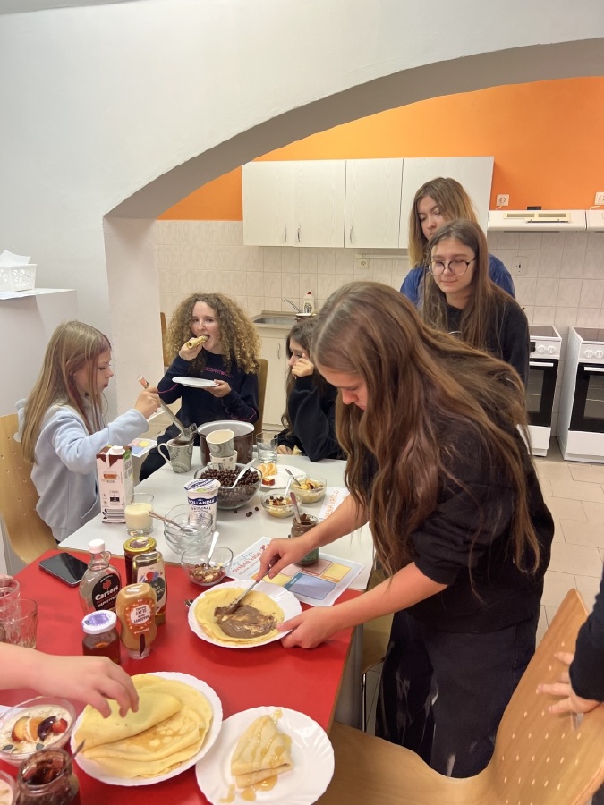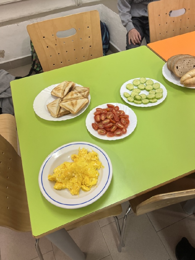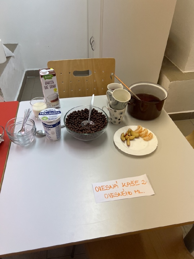 V rámci druhého setkání našeho snídaňového klubu jsme si společně připravili oblíbenou snídaňovou kaši ve dvou verzích – z kravského a z ovesného mléka. Skupiny, které měly kaši na starosti, ji krásně dozdobily ovocem, oříšky a netradičními sladidly, například čekankovým sirupem nebo medem. Další skupiny připravovaly míchaná vajíčka, sendviče a palačinky, zatímco ostatní krájeli zeleninu a ovoce a pomáhali chystat celý snídaňový bufet. Nešlo však jen o vaření – před samotnou přípravou žáci pracovali ve skupinách, počítali energetickou hodnotu surovin, převáděli kalorie na kilojouly a diskutovali o tom, které potraviny jsou udržitelnější. Velká pochvala patří celé třídě, které se podařilo vše připravit i uklidit během jediné vyučovací hodiny! Dopoledne se neslo ve znamení spolupráce, dobré nálady a zdravého jídla, které si všichni po zásluze vychutnali. Den zdravěji! Ing. Šárka Nováková