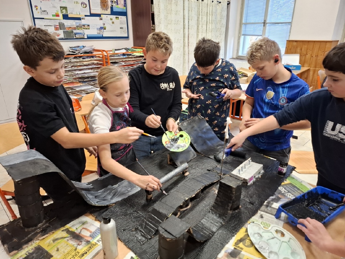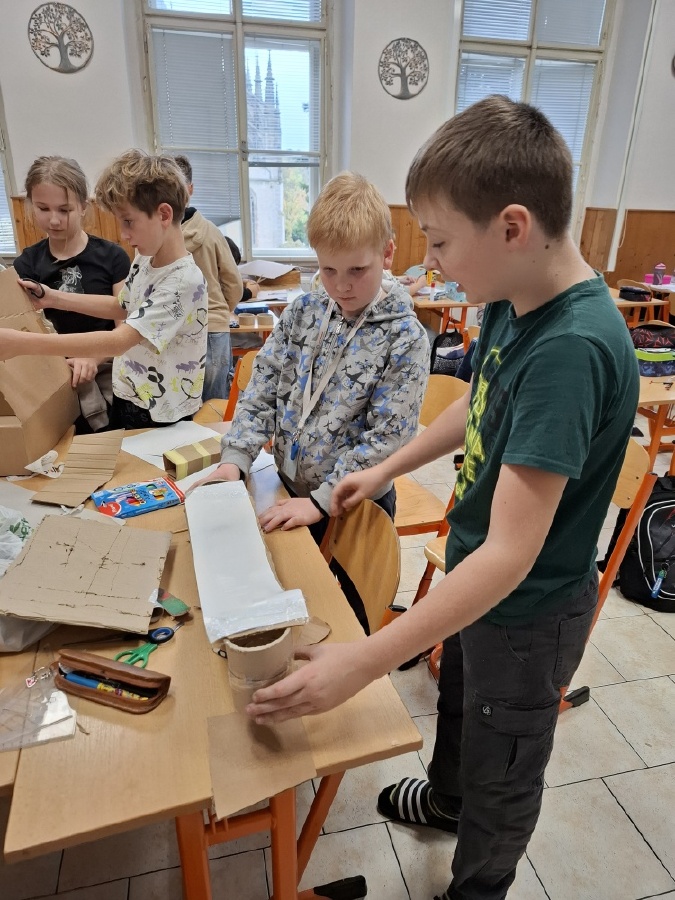 Hodiny výtvarné výchovy u nás v V.C patřily od konce října mimo jiné realizaci skateparku pro fingerboardy a prstové koloběžky. Do společného projektu jsme se pustili proto, abychom posílili dobré vztahy ve třídě. Zjistili jsme totiž, že spousta z nás má buď fingerboard nebo prstovou koloběžku, že nás baví s nimi dělat různé triky, ale nemáme pro to ideální prostor. Práce na skateparku nás opravdu bavila a ukázali jsme, že pokud se pro něco nadchneme, umíme být skvělý tým. Při výrobě jsme využili staré krabice a papírové role, takže jsme smysluplně využili materiál, který by jinak skončil v popelnici. Zároveň nám skatepark umožní trávit přestávky hrou a na mobilní telefony si ani nevzpomeneme. Zkušební provoz zahájí v učebně Z a pokud se osvědčí, umístíme ho na chodbu před učebnu, aby ho mohli využívat i ostatní. Mgr. Daniela Podoláková