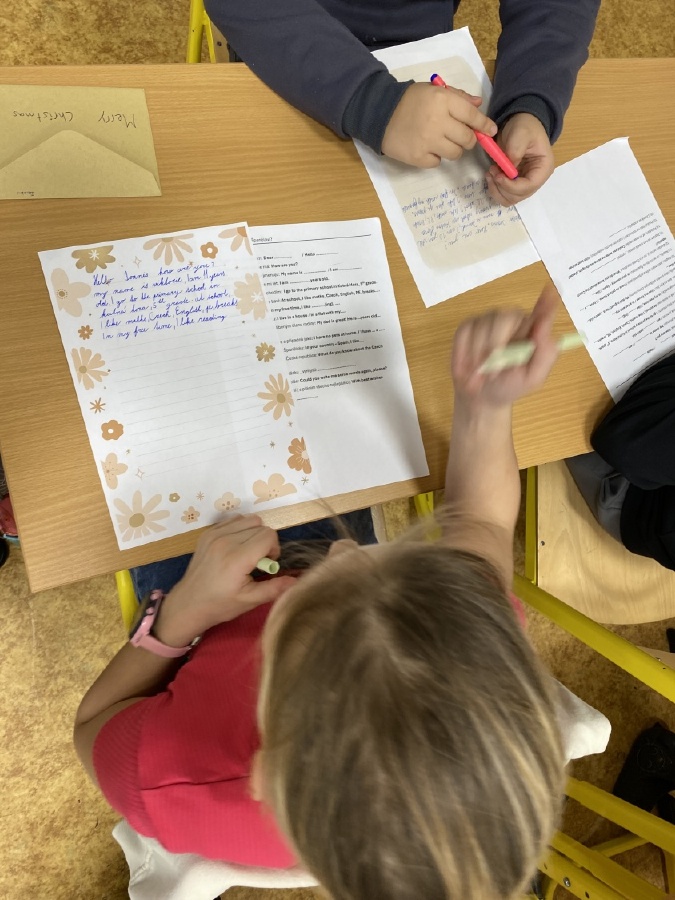 Před vánočními svátky jsme započali spolupráci se španělskou školou ve Els Pallaresos v Catalonii - dopisujeme si. A to žádné e-maily ani esemesky, ale rukou psané dopisy posílané poštou. Na naše vánoční přání, která napsaly děti z V. B a V. D, jsme v lednu dostali odpovědi. A protože už toho páťáci uměli v lednu zase o něco více z angličtiny, i jejich další dopisy byly trochu obsáhlejší. Procvičili jsme tím nejen aktuálně probíraná témata, ve kterých děti vylepšují svou schopnost vyjádřit se v anglických větách o sobě, své rodině, svých preferencích a zálibách, ale i vhodný obsah a části dopisu. S dopomocí to zvládli všichni! Je jiné učit se při školní výuce a poté být zodpovědný za to, co anglicky napíšu pro někoho ve Španělsku tak, aby mi porozuměl a pochopil mé myšlenky. A právě to zažívaly děti při projektu v dopisování. Takže se vylepšují i ve své schopnosti písemné komunikace a čitelného psaní. A kdy jste dostali naposledy dopis Vy? Že je to moc milé potěšení, by vám páťáci už mohli vyprávět... Mgr. Alena Tyrkasová, Mgr. Nikola Lukešová, Mgr. Kristýna Hurychová