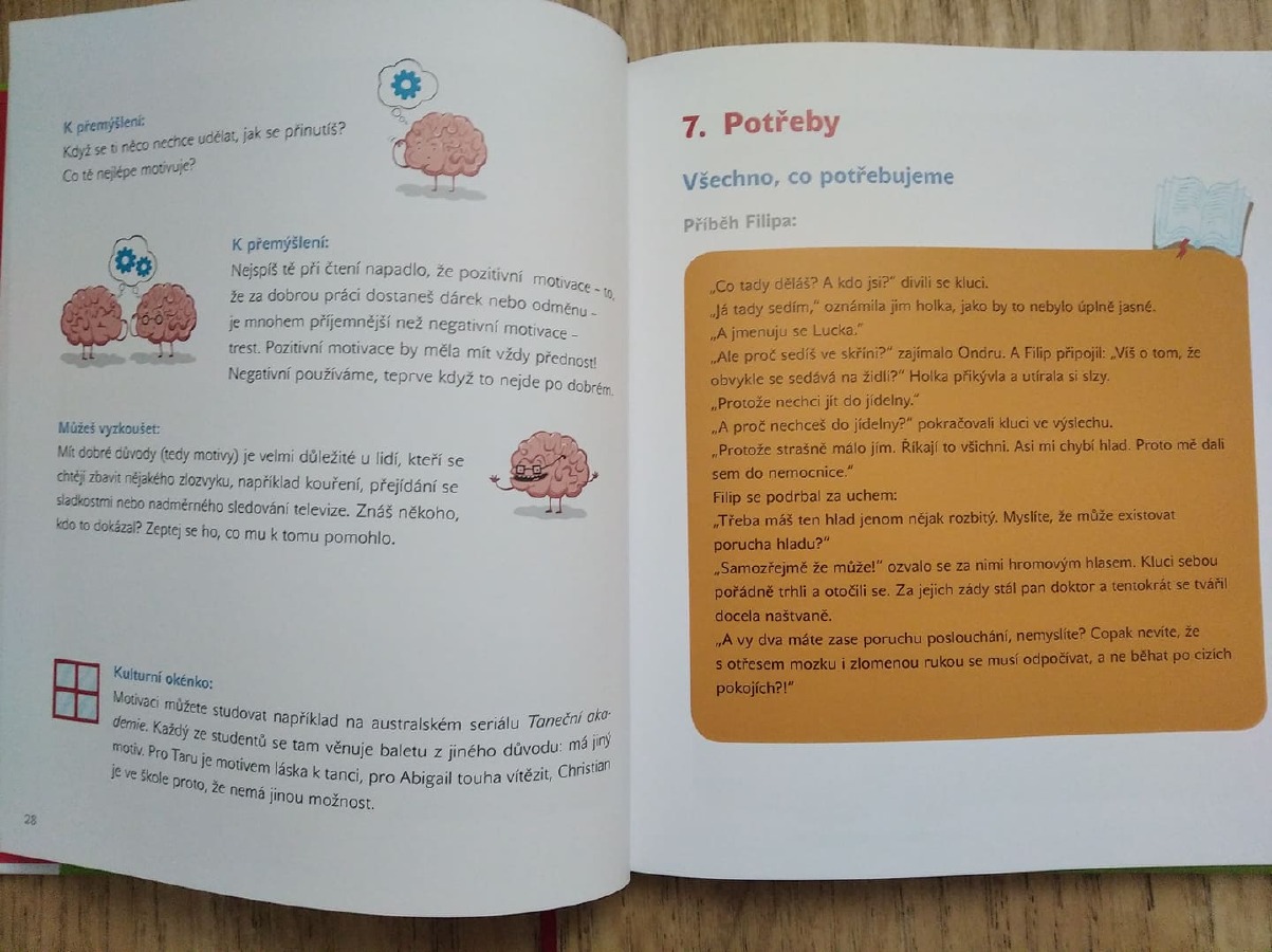 Zajímalo vás někdy, proč se někdy smějeme a jindy jsme smutní? Proč máme strach, vztek nebo trému? A co se vlastně děje v našem mozku, když přemýšlíme? Autorka chtěla dětem co nejpřitažlivější formou předat základní povědomí o psychologii, a to tak, aby byly informace srozumitelné i nejmladším čtenářům. Jednotlivé kapitoly se věnují například našemu vnímání, citům a pocitům, pozornosti, paměti, učení apod. Příběh chlapce Filipa, který se ocitne v nemocnici po úrazu hlavy, slouží jako rámec pro vysvětlení základních psychologických pojmů. Čtenáře při četbě provází mozek Filipa, který zábavnou formou doplňuje příslušné odborné informace. Kniha je určená především dětem školního věku, ale ocení ji i jejich rodiče a pedagogové.