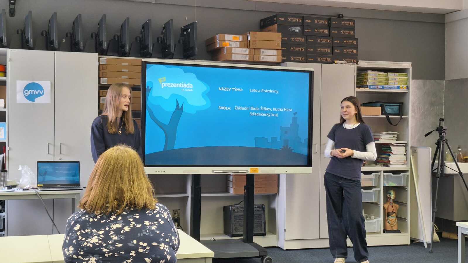 V pondělí 16. března se na Gymnáziu mezinárodních a veřejných vztahů v Praze uskutečnilo krajské kolo soutěže Prezentiáda, v kategorii základních škol a nižších gymnázií. Celkem bylo nominováno deset týmů ze Středočeského kraje, které představily letošní témata Kapka v moři a Na hraně. Všechny týmy se s vybranými tématy vyrovnaly velmi dobře – prezentace byly nápadité, promyšlené a ukázaly, že soutěžící dokážou pracovat nejen s informacemi, ale také ukázaly, že soutěžící nad zadanými tématy přemýšlejí do hloubky, dokážou formulovat vlastní názory a postoje a hledat různá východiska. Po velmi napínavém souboji se porota dlouhou hodinu radila o konečném pořadí účastníků. Na 3. a 2. místě se nakonec umístily týmy z Mladé Boleslavi. K velkému překvapení a obrovské radosti získal 1. místo náš dívčí tým Léto a Prázdniny ve složení Eliška Skaláková a Klára Vlášková, který si tím vybojoval postup do Grandfinále, kde se utká s nejlepšími týmy z celé České republiky i Slovenska.