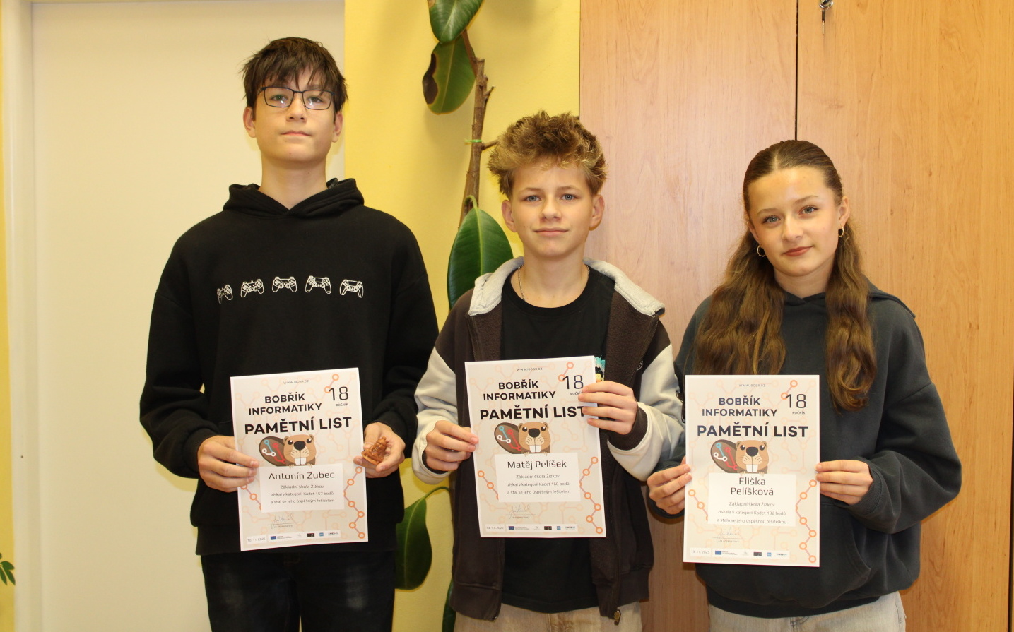 Prvních čtrnáct dní v listopadu proběhla v naší škole informatická soutěž s názvem Bobřík informatiky. Soutěže se účastníme již několik let. Jejím cílem je seznamovat žáky s tím, co to jsou informatické úlohy a problémy, a že informatika není totéž co ovládání počítače. Soutěží se v pěti věkových kategoriích od 3. ročníku ZŠ po maturitu. Soutěžící odpovídají na otázky z oblasti informatického myšlení, algoritmizace, porozumění informacím, práce s daty, informačních systémů a modelování, z oblasti digitálních technologií a společenských aspektů jejich použití. Soutěžící vyplňují online test, v němž vybírají z několika odpovědí nebo vybírají či přemísťují objekty na obrazovce, případně sestavují program z bloků. Kdo byli naši nejúspěšnější bobříci v jednotlivých kategoriích?