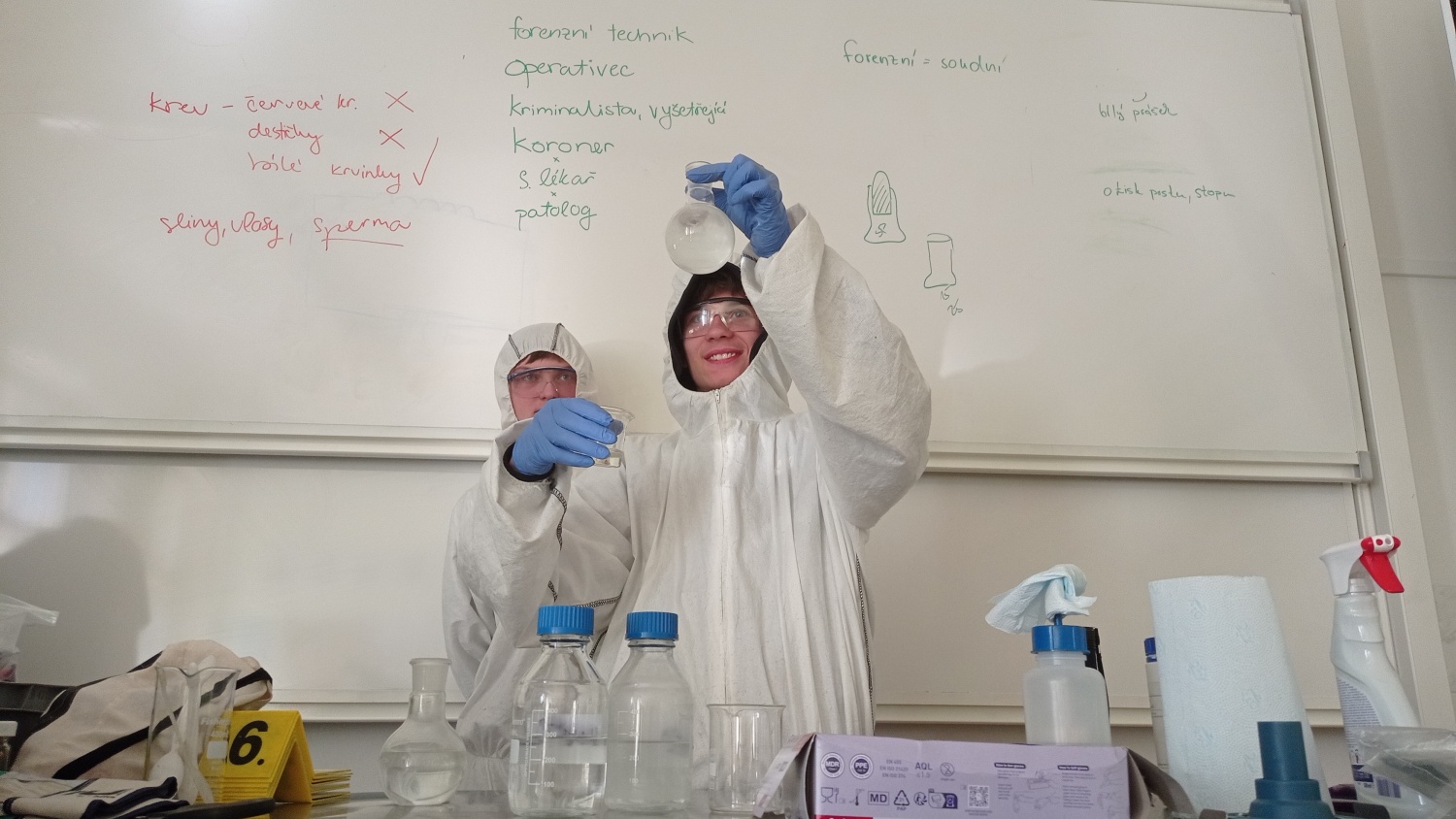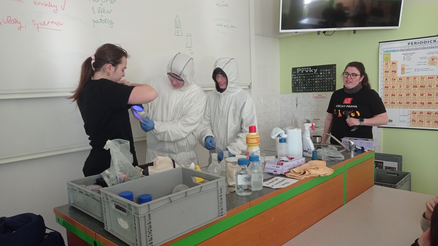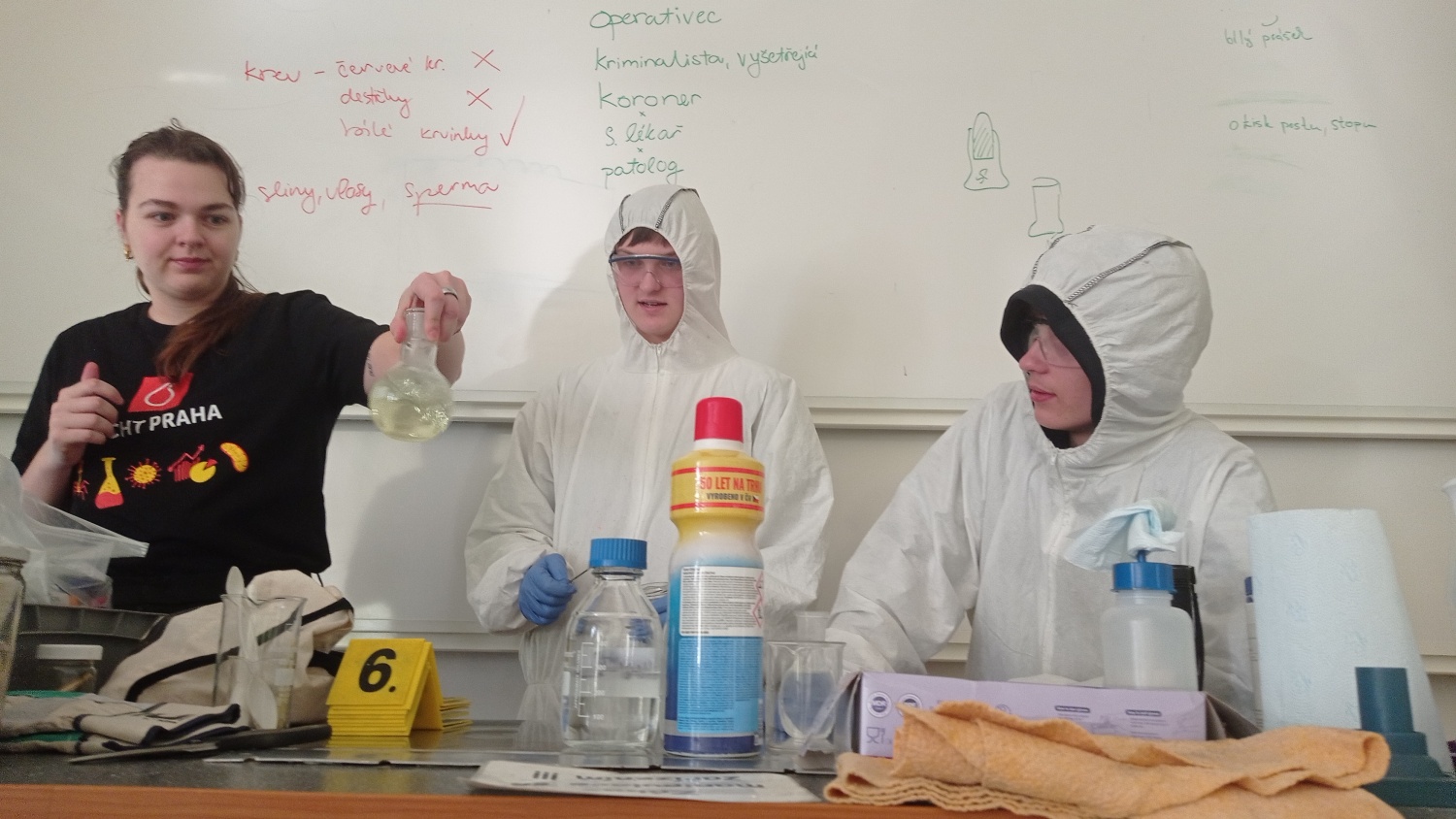 V pátek 6. března proběhla v IX. A a IX. B hodina moderní chemie na téma forenzní analýza. V úvodní části jsme si vysvětlili, co je forenzní analýza, jakou roli má operativec a vyšetřovatel a jak správně postupovat při vyšetřování. Dva žáci - operativci si tento postup prakticky vyzkoušeli. Zároveň jsme vyvrátili několik mýtů a nepravdivých postupů, které se objevují v detektivních seriálech. Na závěr jsme si vyzkoušeli techniku odebírání otisků prstů. Hodiny moderní chemie jsou popularizačním projektem VŠCHT Praha a jejich cílem je zábavnou formou - pokusy a dialogy - představit žákům na ZŠ a SŠ chemii v každodenním životě.