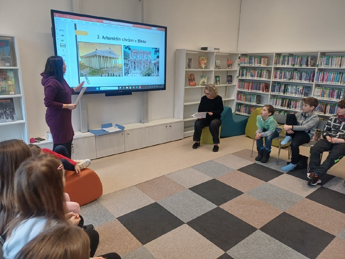 Třída IV.D navštívila Kutnohorskou knihovnu, kde si pro nás paní knihovnice připravily velmi zajímavý a poutavý program na téma sedm divů světa. Děti se dozvěděly, které stavby mezi sedm divů světa patří, a některé z nich dokázaly jednotlivé divy dokonce samy vyjmenovat. Postupně jsme se seznamovali s jednotlivými divy starověkého světa a dozvěděli se o nich mnoho zajímavostí. Například Velká pyramida v Gíze je jediným divem světa, který se dochoval dodnes, socha boha Dia v Olympii byla vyrobena ze zlata a slonoviny. Součástí programu bylo také video, které dětem pomohlo vše přehledně shrnout. Na závěr si žáci ve skupinkách vyzkoušeli své znalosti v praktickém úkolu – přiřazovali správné obrázky, názvy a informace k jednotlivým divům světa. Všem skupinám se úkol podařilo splnit na jedničku. Program se dětem velmi líbil a odcházely nadšené a plné nových poznatků. Už teď se těšíme na další setkání v knihovně. Děkujeme paním knihovnicím za milý přístup a velmi zajímavý a povedený program. Mgr. Miroslava Falgeová