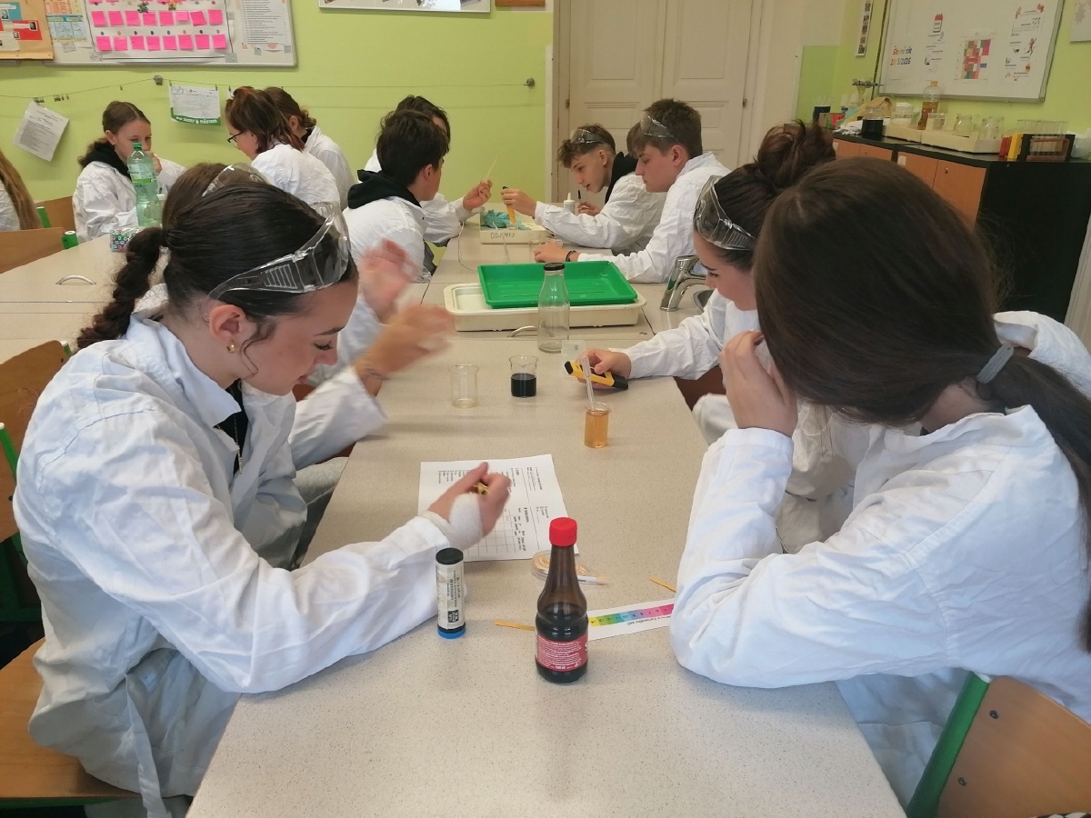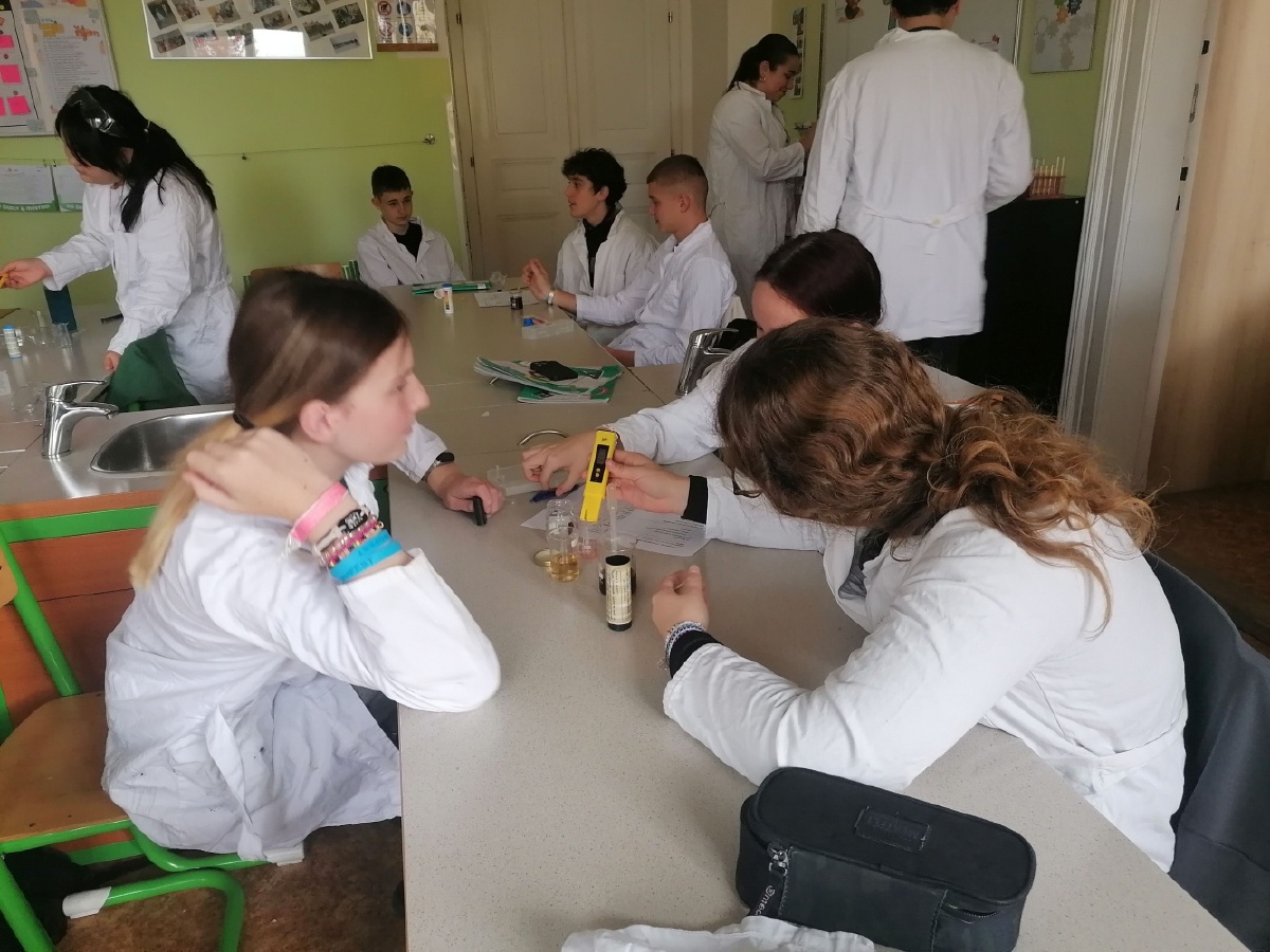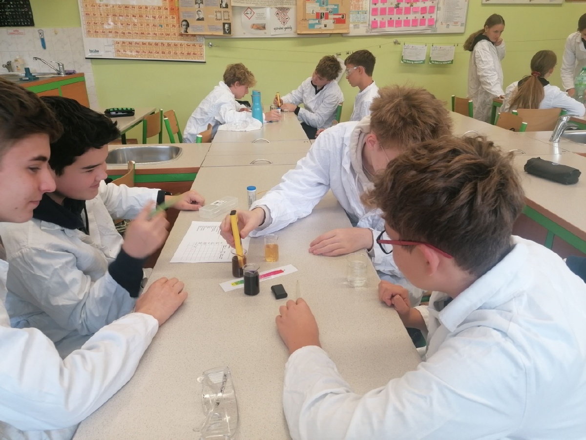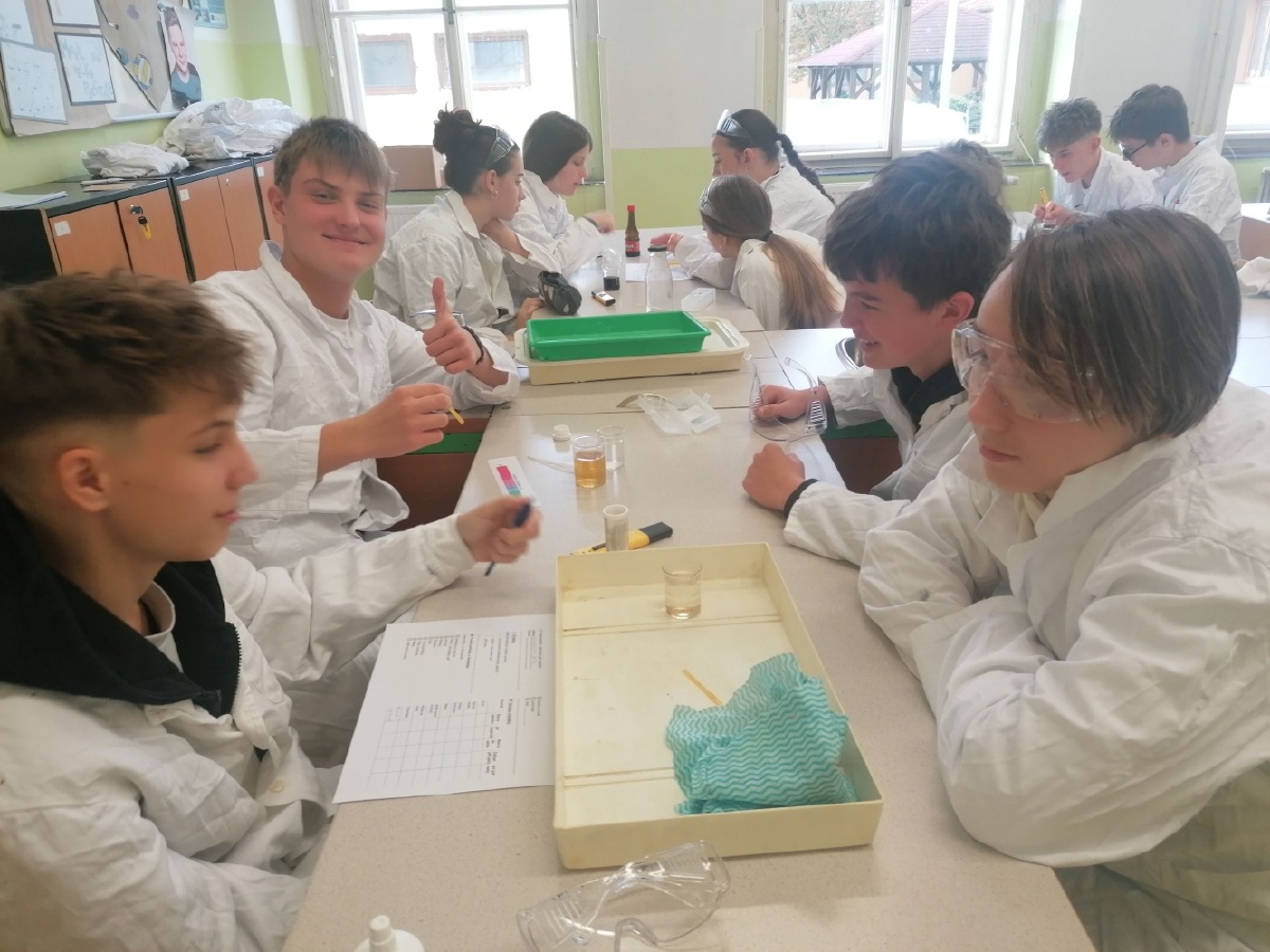 Deváťáci z A a B si během hodiny chemie procvičili určování pH různých kapalných roztoků. Nejprve použili univerzální indikátorový papírek, který mění barvu podle hodnoty pH. Dále si vyzkoušeli práci s přírodním indikátorem – odvarem z červeného zelí, který rovněž reaguje na kyselé a zásadité prostředí změnou barvy. Pro přesné určení pH poté použili pH metr. Porovnáním výsledků z jednotlivých metod mohli pozorovat rozdíly v přesnosti měření a lépe pochopit vlastnosti kyselin a zásad. Práce je nejen bavila, ale také jim přinesla cenné zkušenosti z praktické chemie. Mgr. Hana Ratajíková