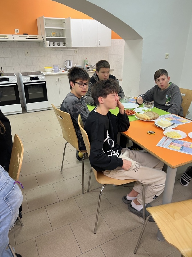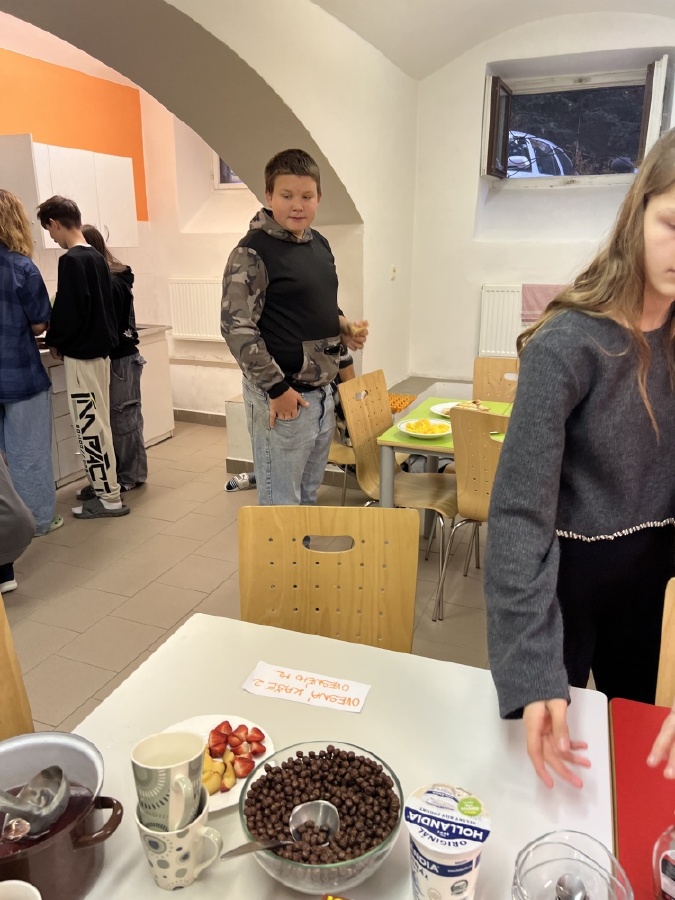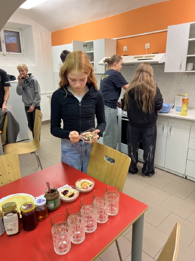 V rámci druhého setkání našeho snídaňového klubu jsme si společně připravili oblíbenou snídaňovou kaši ve dvou verzích – z kravského a z ovesného mléka. Skupiny, které měly kaši na starosti, ji krásně dozdobily ovocem, oříšky a netradičními sladidly, například čekankovým sirupem nebo medem. Další skupiny připravovaly míchaná vajíčka, sendviče a palačinky, zatímco ostatní krájeli zeleninu a ovoce a pomáhali chystat celý snídaňový bufet. Nešlo však jen o vaření – před samotnou přípravou žáci pracovali ve skupinách, počítali energetickou hodnotu surovin, převáděli kalorie na kilojouly a diskutovali o tom, které potraviny jsou udržitelnější. Velká pochvala patří celé třídě, které se podařilo vše připravit i uklidit během jediné vyučovací hodiny! Dopoledne se neslo ve znamení spolupráce, dobré nálady a zdravého jídla, které si všichni po zásluze vychutnali. Den zdravěji! Ing. Šárka Nováková