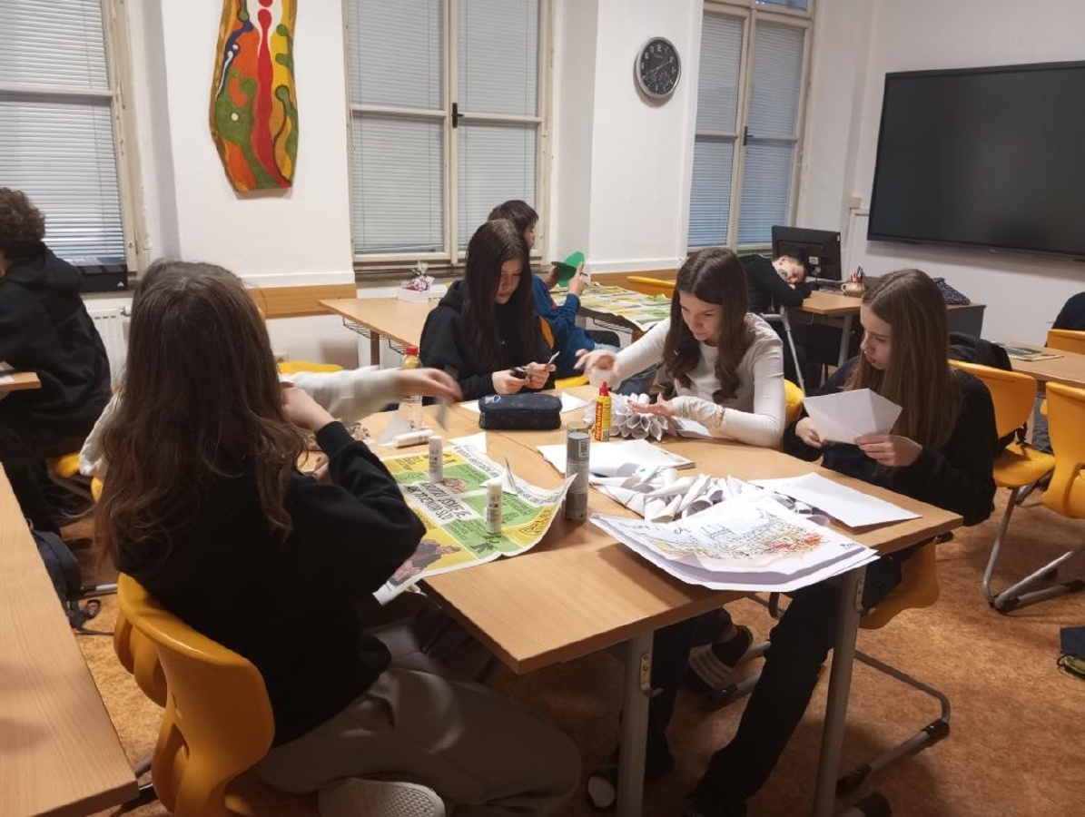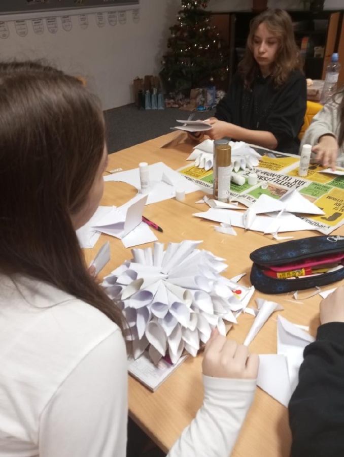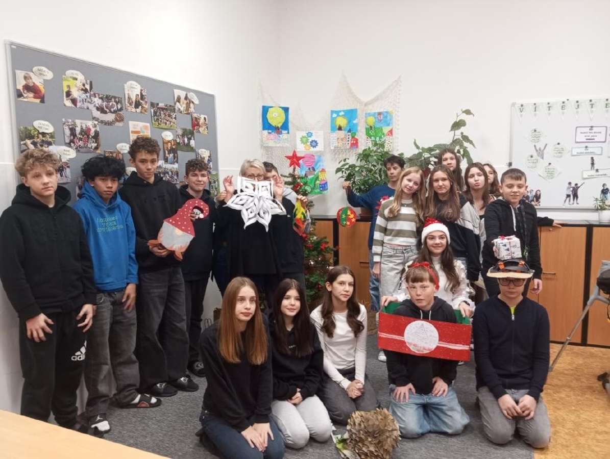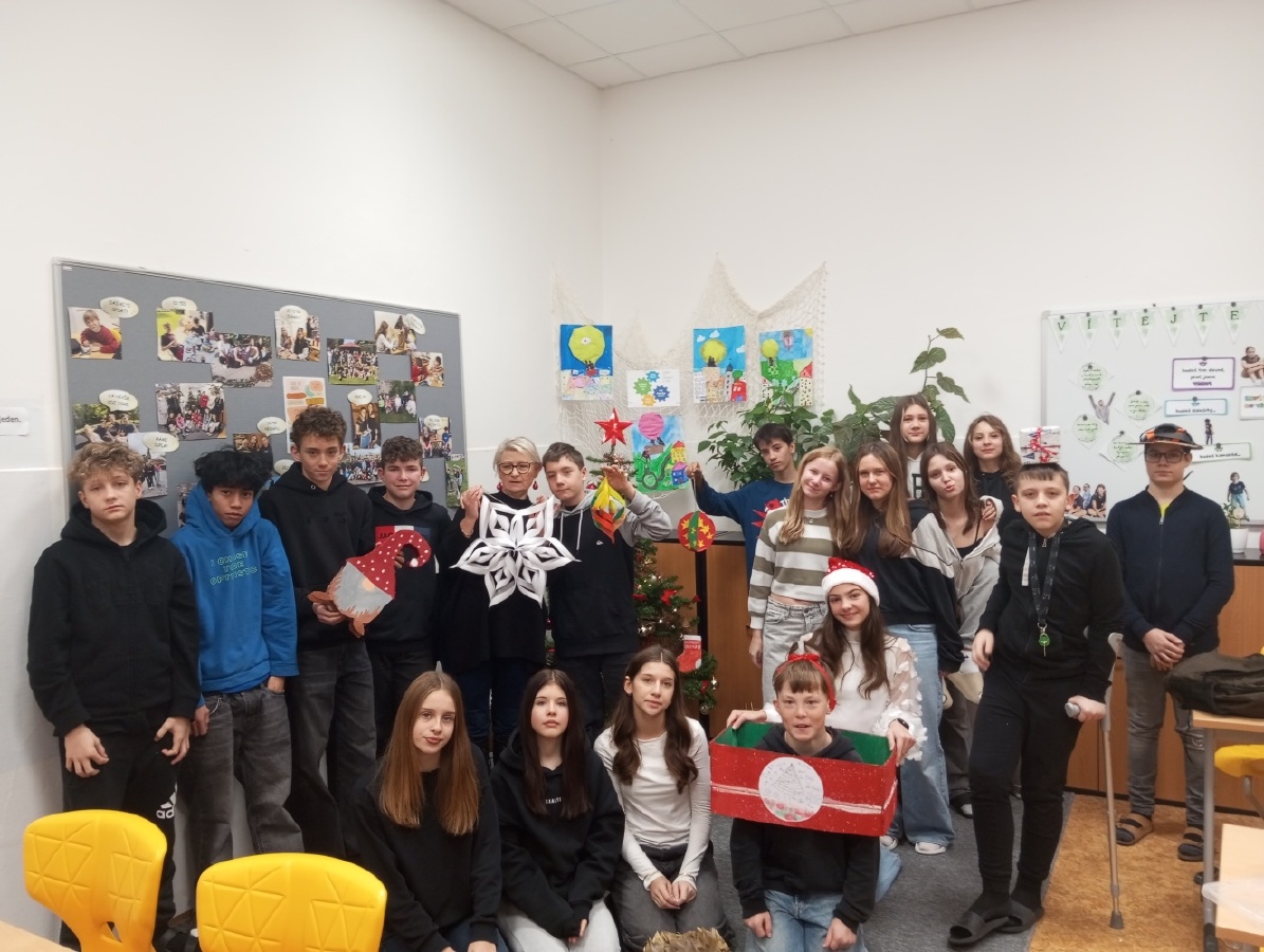 Poslední hodina výtvarné výchovy ve třídě VII. B proběhla ve stylu soutěže o nejoriginálnější vánoční ozdobu. Děti pracovaly ve skupinách a s chutí se pustily do práce, ke konci hodiny si připravily prezentaci, kde vzájemně hodnotily své výrobky. Nakonec svými pracemi doplnily vánoční výzdobu ve třídě. Mgr. Irena Komárková