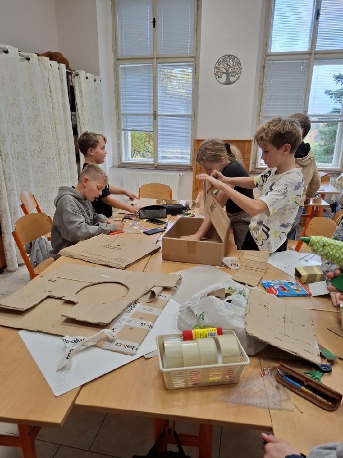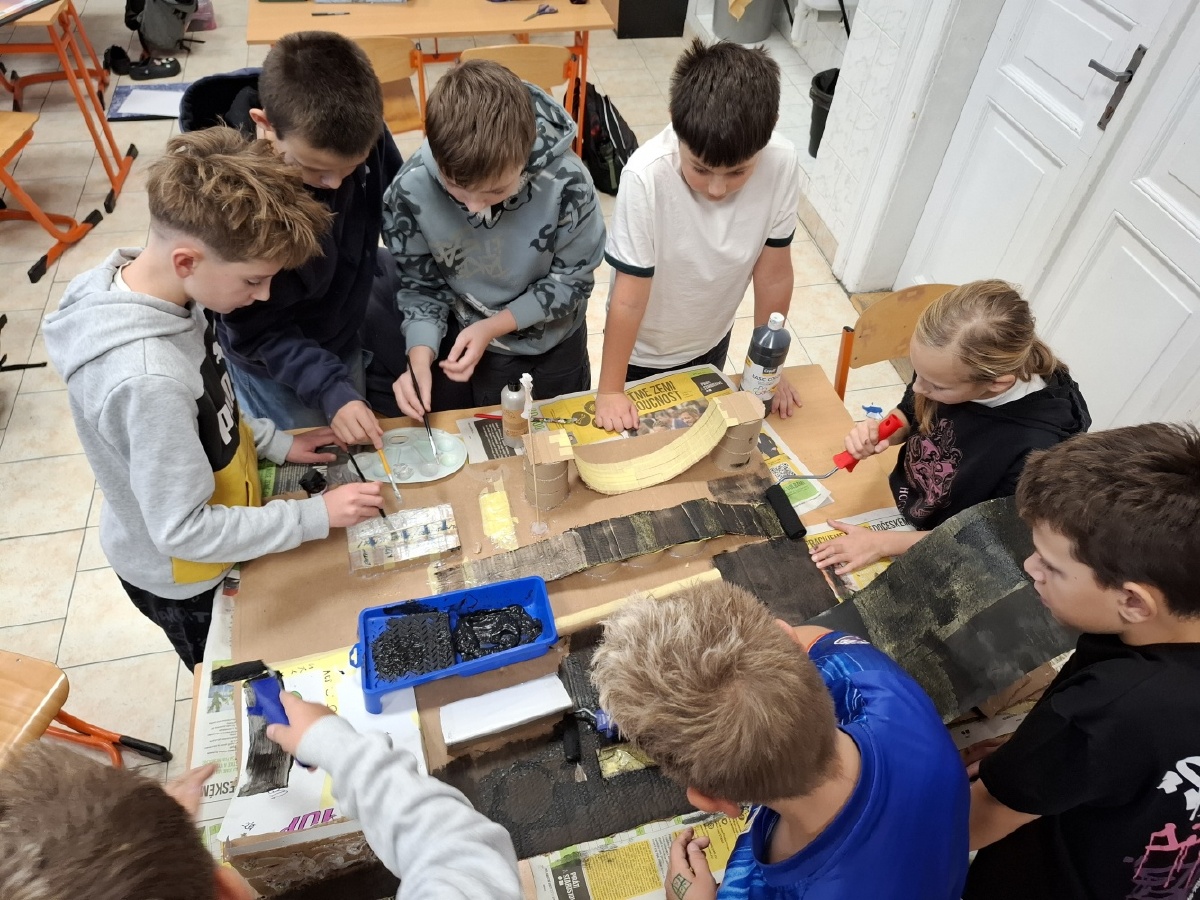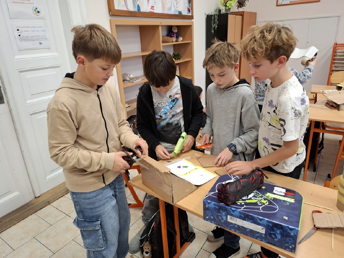 Hodiny výtvarné výchovy u nás v V.C patřily od konce října mimo jiné realizaci skateparku pro fingerboardy a prstové koloběžky. Do společného projektu jsme se pustili proto, abychom posílili dobré vztahy ve třídě. Zjistili jsme totiž, že spousta z nás má buď fingerboard nebo prstovou koloběžku, že nás baví s nimi dělat různé triky, ale nemáme pro to ideální prostor. Práce na skateparku nás opravdu bavila a ukázali jsme, že pokud se pro něco nadchneme, umíme být skvělý tým. Při výrobě jsme využili staré krabice a papírové role, takže jsme smysluplně využili materiál, který by jinak skončil v popelnici. Zároveň nám skatepark umožní trávit přestávky hrou a na mobilní telefony si ani nevzpomeneme. Zkušební provoz zahájí v učebně Z a pokud se osvědčí, umístíme ho na chodbu před učebnu, aby ho mohli využívat i ostatní. Mgr. Daniela Podoláková