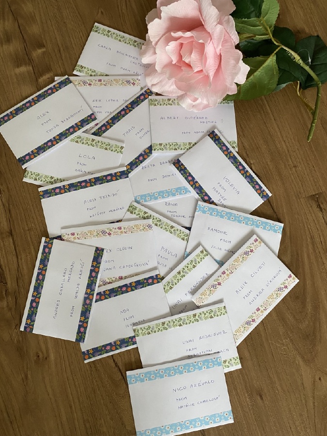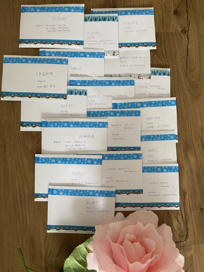 Před vánočními svátky jsme započali spolupráci se španělskou školou ve Els Pallaresos v Catalonii - dopisujeme si. A to žádné e-maily ani esemesky, ale rukou psané dopisy posílané poštou. Na naše vánoční přání, která napsaly děti z V. B a V. D, jsme v lednu dostali odpovědi. A protože už toho páťáci uměli v lednu zase o něco více z angličtiny, i jejich další dopisy byly trochu obsáhlejší. Procvičili jsme tím nejen aktuálně probíraná témata, ve kterých děti vylepšují svou schopnost vyjádřit se v anglických větách o sobě, své rodině, svých preferencích a zálibách, ale i vhodný obsah a části dopisu. S dopomocí to zvládli všichni! Je jiné učit se při školní výuce a poté být zodpovědný za to, co anglicky napíšu pro někoho ve Španělsku tak, aby mi porozuměl a pochopil mé myšlenky. A právě to zažívaly děti při projektu v dopisování. Takže se vylepšují i ve své schopnosti písemné komunikace a čitelného psaní. A kdy jste dostali naposledy dopis Vy? Že je to moc milé potěšení, by vám páťáci už mohli vyprávět... Mgr. Alena Tyrkasová, Mgr. Nikola Lukešová, Mgr. Kristýna Hurychová