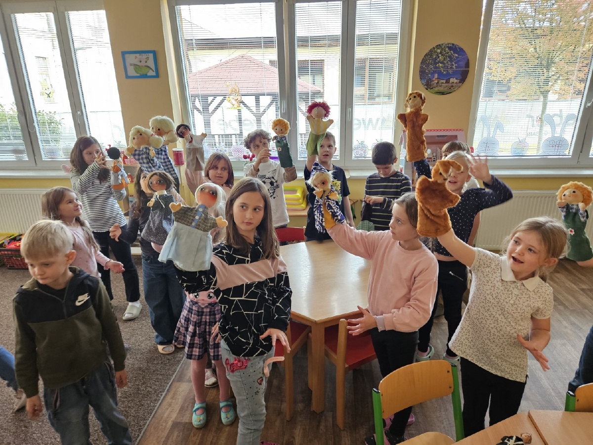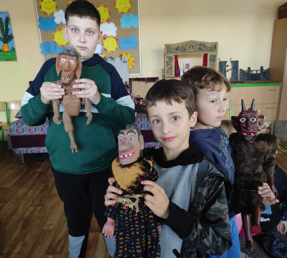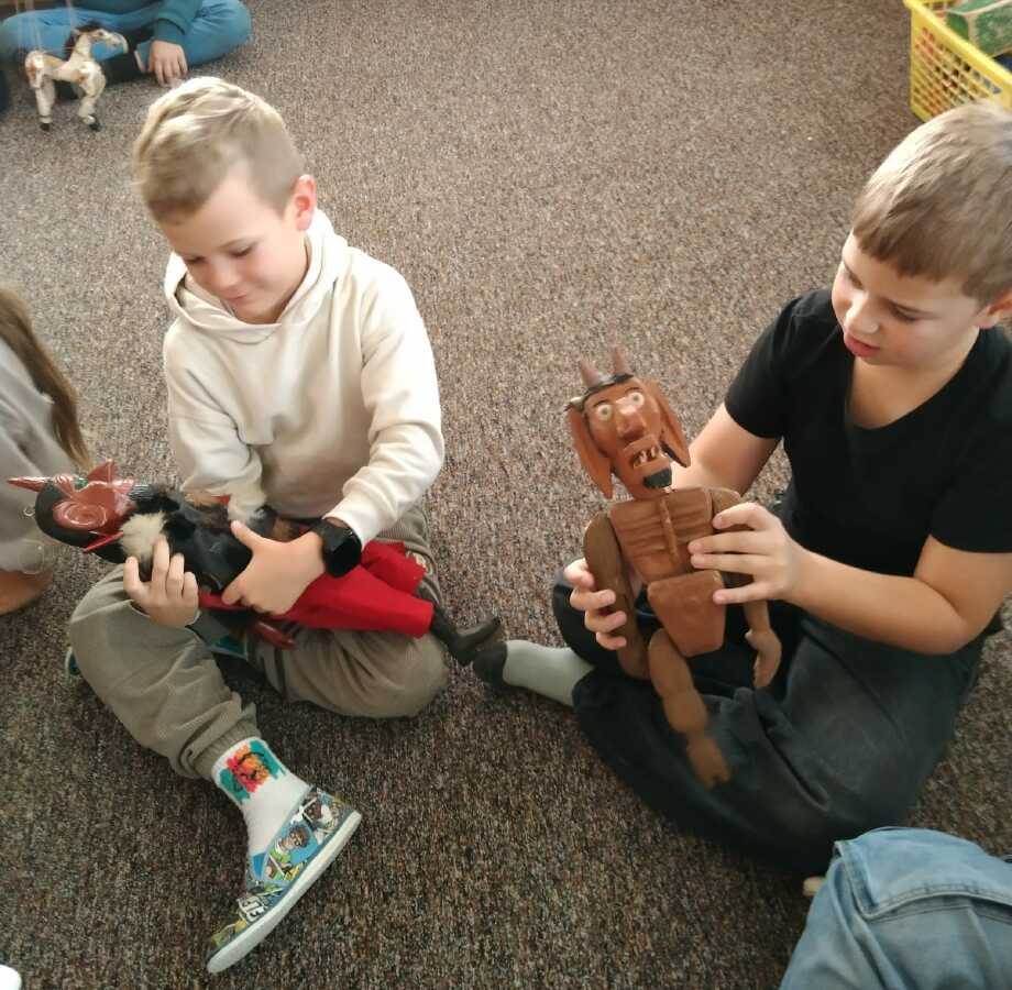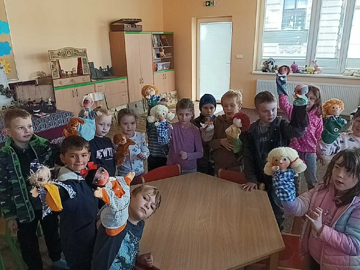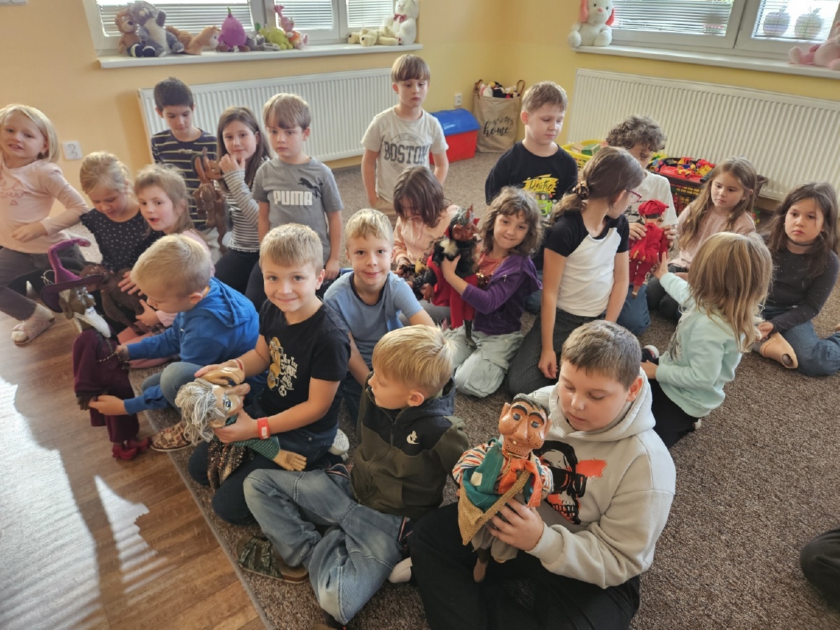 V pondělí 13.října zavítaly do školní družiny loutky ze sbírky naší paní vychovatelky z oddělení Včeliček. Děti se pozdravily s drakem, černokněžníkem, čerty a dalšími postavičkami. Vyzkoušely si, jak se loutky ovládají a také se dozvěděly, z jakých materiálů se vyrábí a z jakých částí se skládají i jaká mají jména. Z rozzářených dětských tváří bylo patrné, že se jim obdivuhodná sbírka moc líbila a každý z nich si moc rád loutku "pochoval".